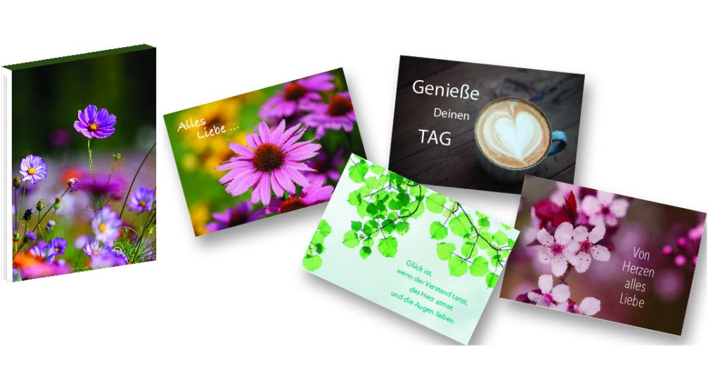 4 verschiedene Karten mit Kuverts und ein Notizblock